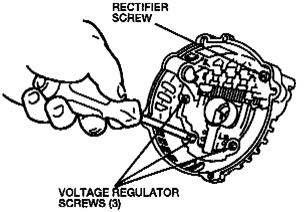 4. Install the rectifier screw and the three voltage regulator screws to the generator rear housing. Tighten the rectifier screw to 2-5 N.m (18-44 Lb-in). Tighten the voltage regulator screws to 2-5 N.m (18-44 Lb-in).