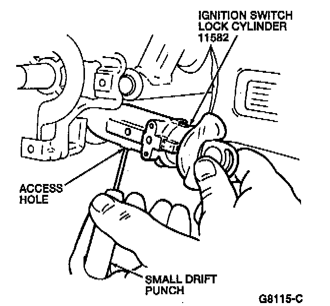 5. Place a 3 mm (1/8 inch) diameter wire pin or small drift punch in the access hole in the lock housing under the ignition switch lock cylinder. Depress the retaining pin while pulling on the ignition switch lock cylinder.