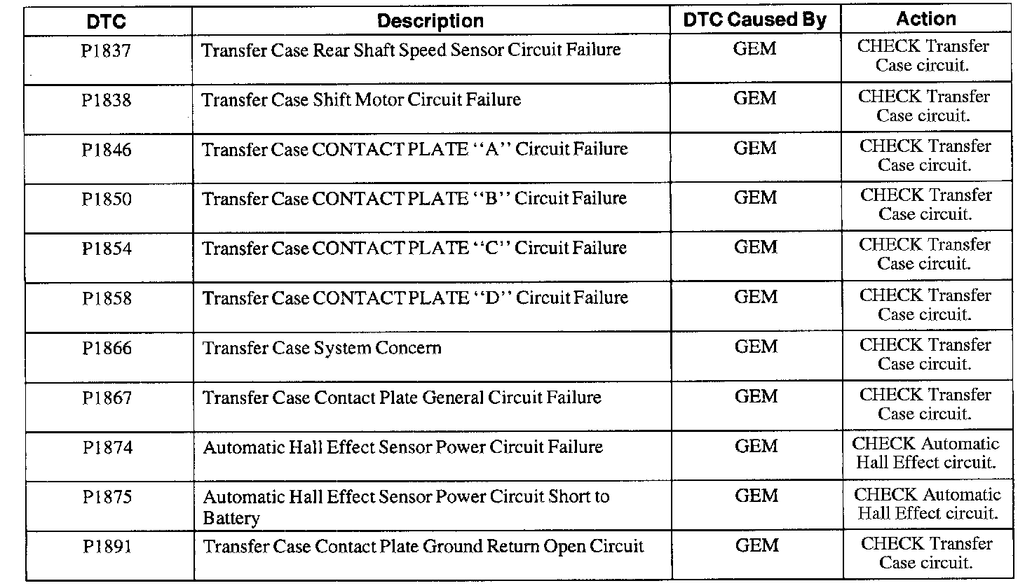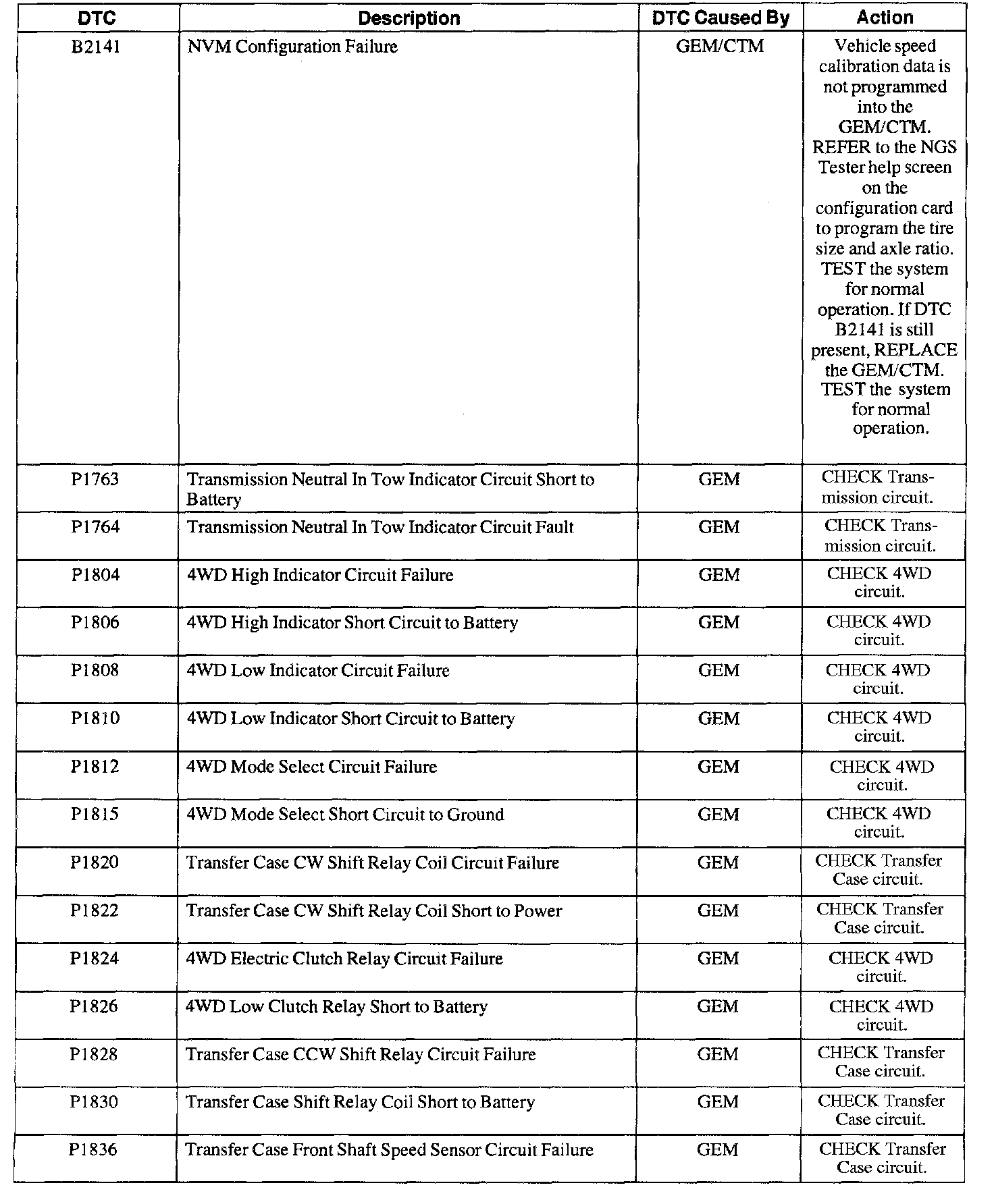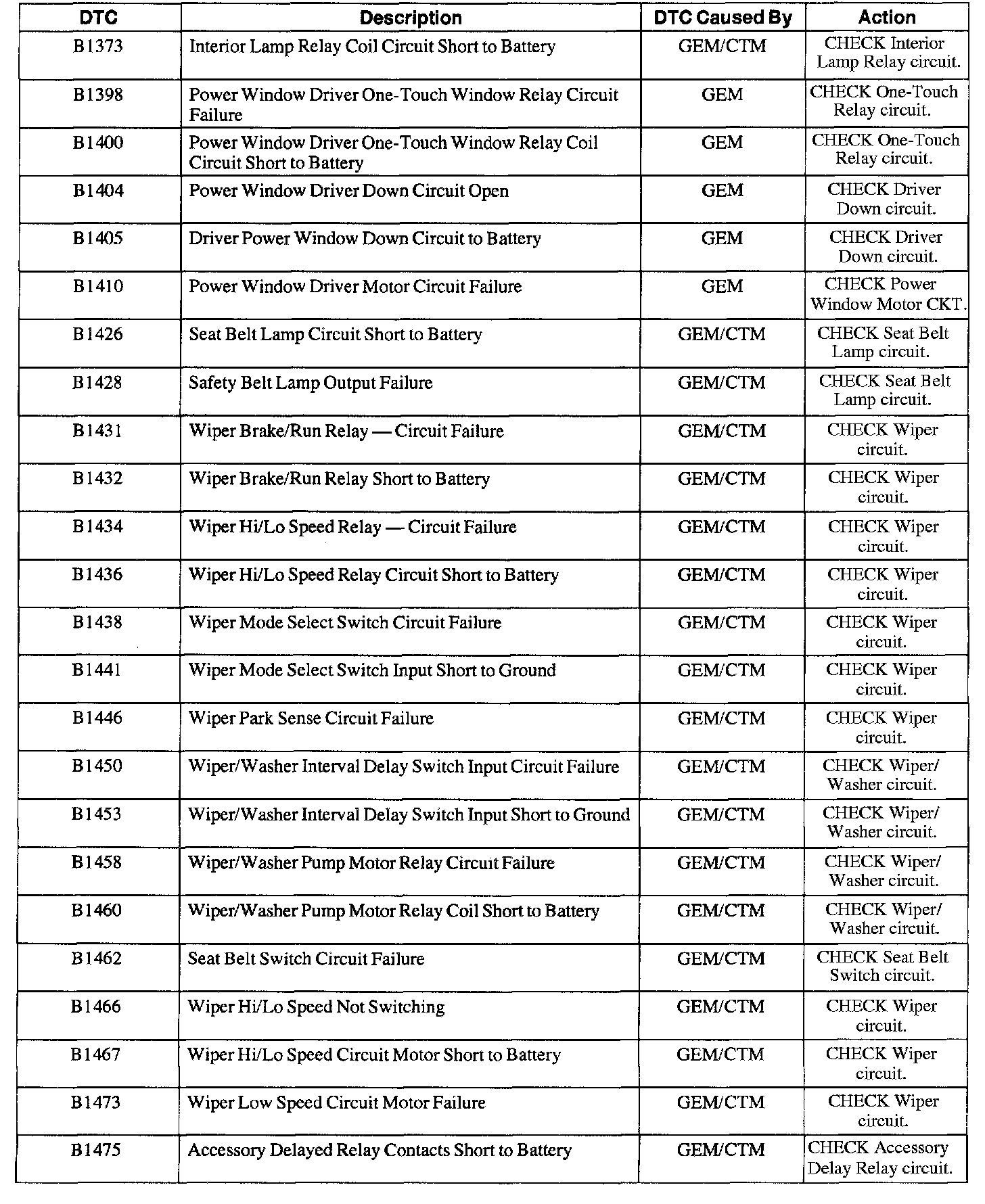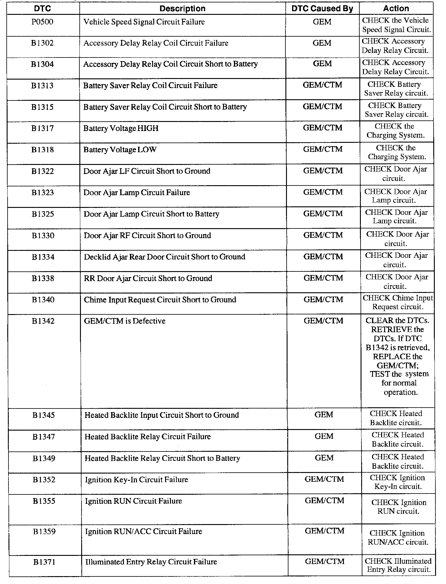 GEM/CTM Diagnostic Trouble Code (DTC) Index