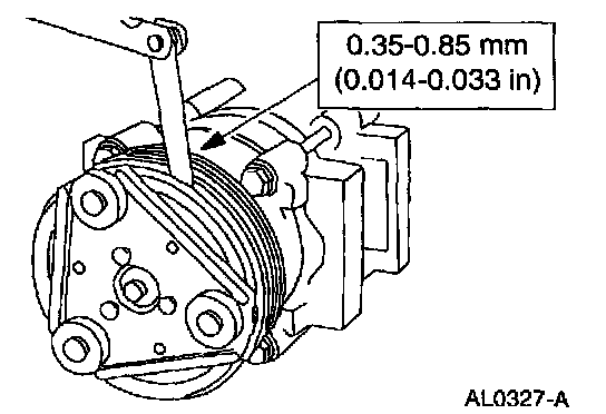 8. Measure and adjust the clutch air gap by removing or adding A/C clutch hub spacers.