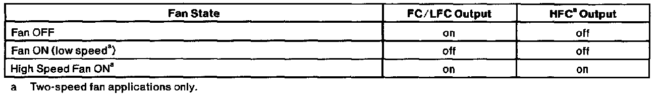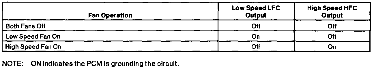 The PCM monitors certain parameters (such as engine coolant temperature, vehicle speed, A/C on/off status, A/C pressure, etc) to determine engine cooling fan needs. The PCM determines engine cooling fan control requirements and controls the fan operation through the LFC and HFC outputs.
