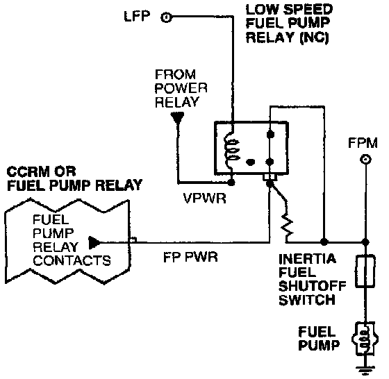 For applications with two speed fuel pumps, a normally closed low speed fuel pump relay is wired into the FP PWR circuit. With the low speed fuel pump relay contacts in the normally closed position, full B+ is sent to the pump for high speed operation. For low speed fuel pump operation, the PCM will ground the Low Fuel Pump circuit, which opens the relay contacts. With the relay contacts open, power to the fuel pump must now pass through a resistor that is wired into the circuit.