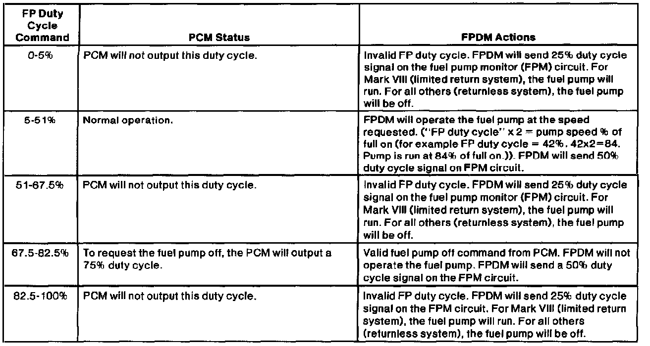 The FP signal is a duty cycle command sent from the PCM to the Fuel Pump Driver Module (FPDM). The FPDM uses the FP command to operate the fuel pump at the speed requested by the PCM or to turn the pump OFF.