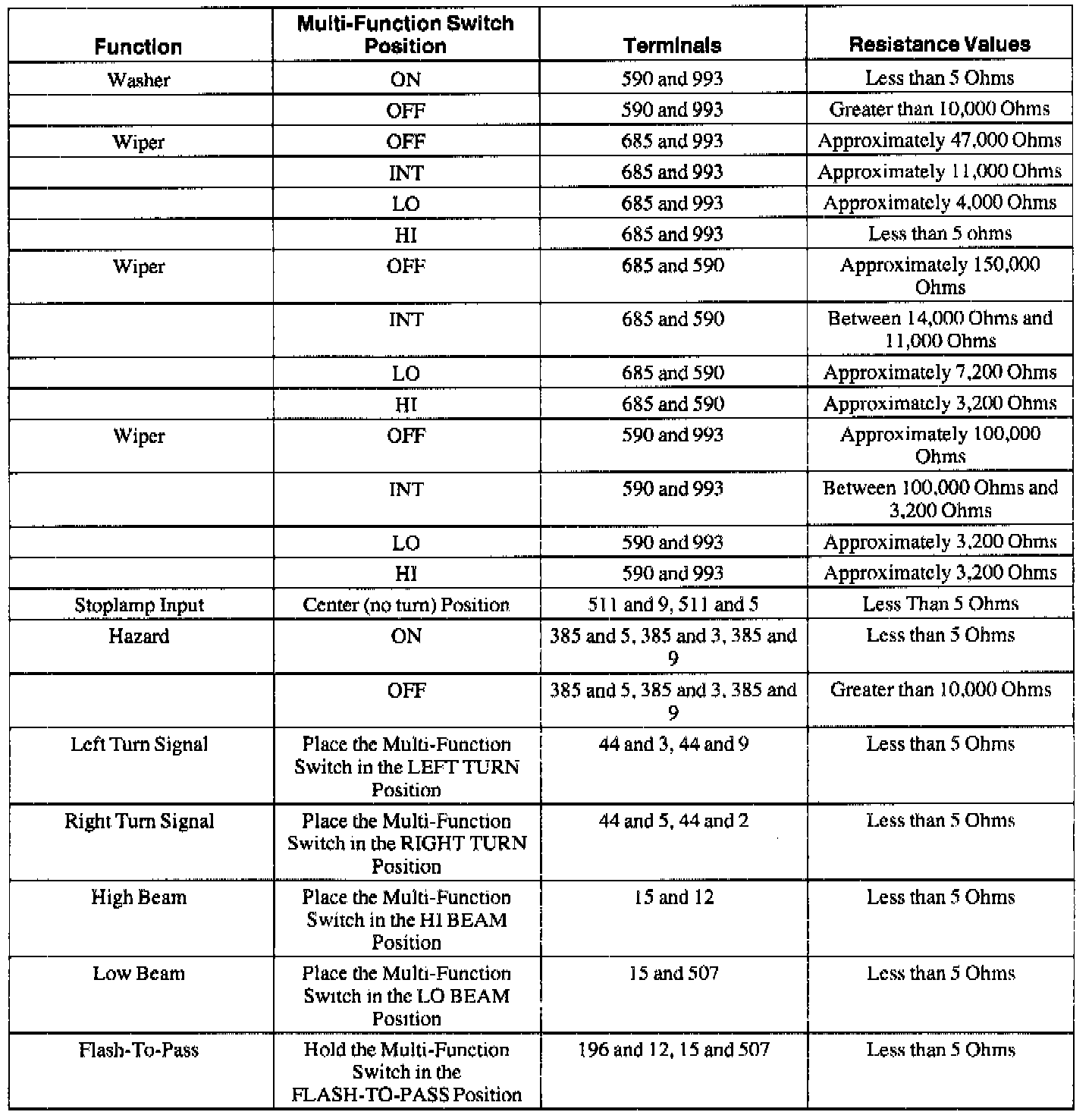 (2) If the resistances are not as specified, Replace the multi-function switch. Test the system for normal operation.