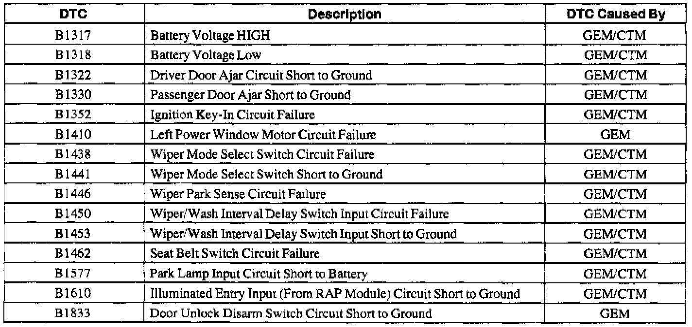 GEM/CTM Wiggle Test Diagnostic Trouble Code (DTC) Index