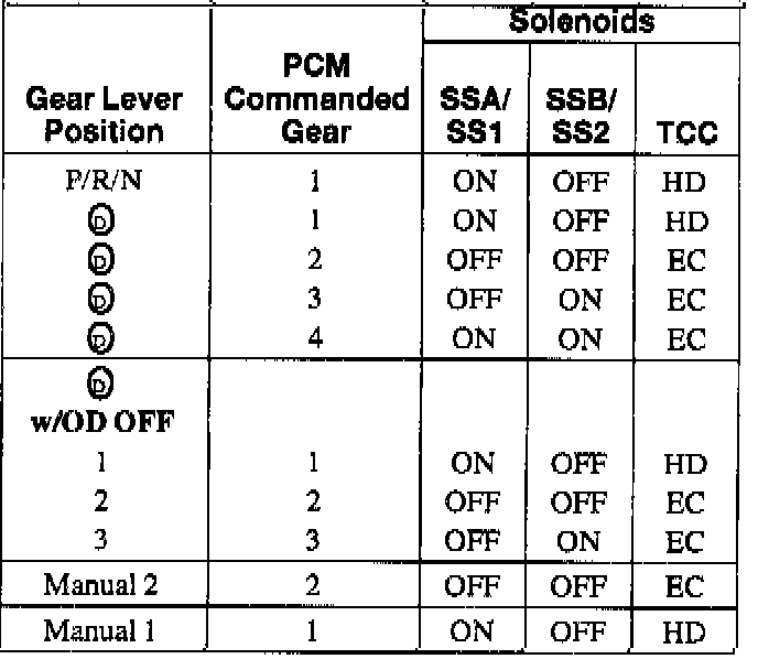 Two on/off shift solenoids provide gear selection of first through fourth gears by controlling the pressure to the three shift valves. One unit containing the two shift solenoids is located in the main control valve body. The shift solenoids are two-way normally open style.