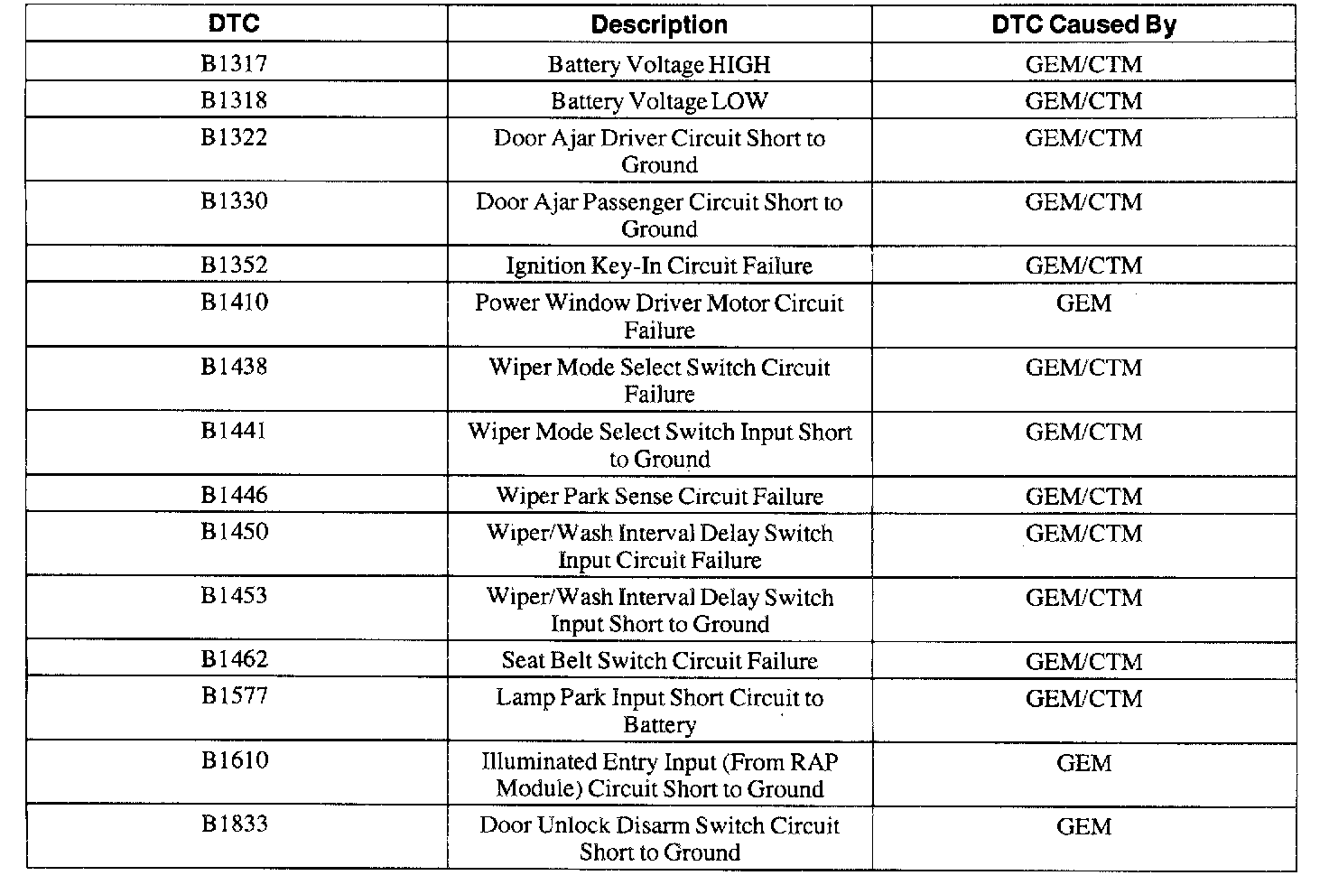 GEM/CTM Wiggle Test Diagnostic Trouble Code Index
