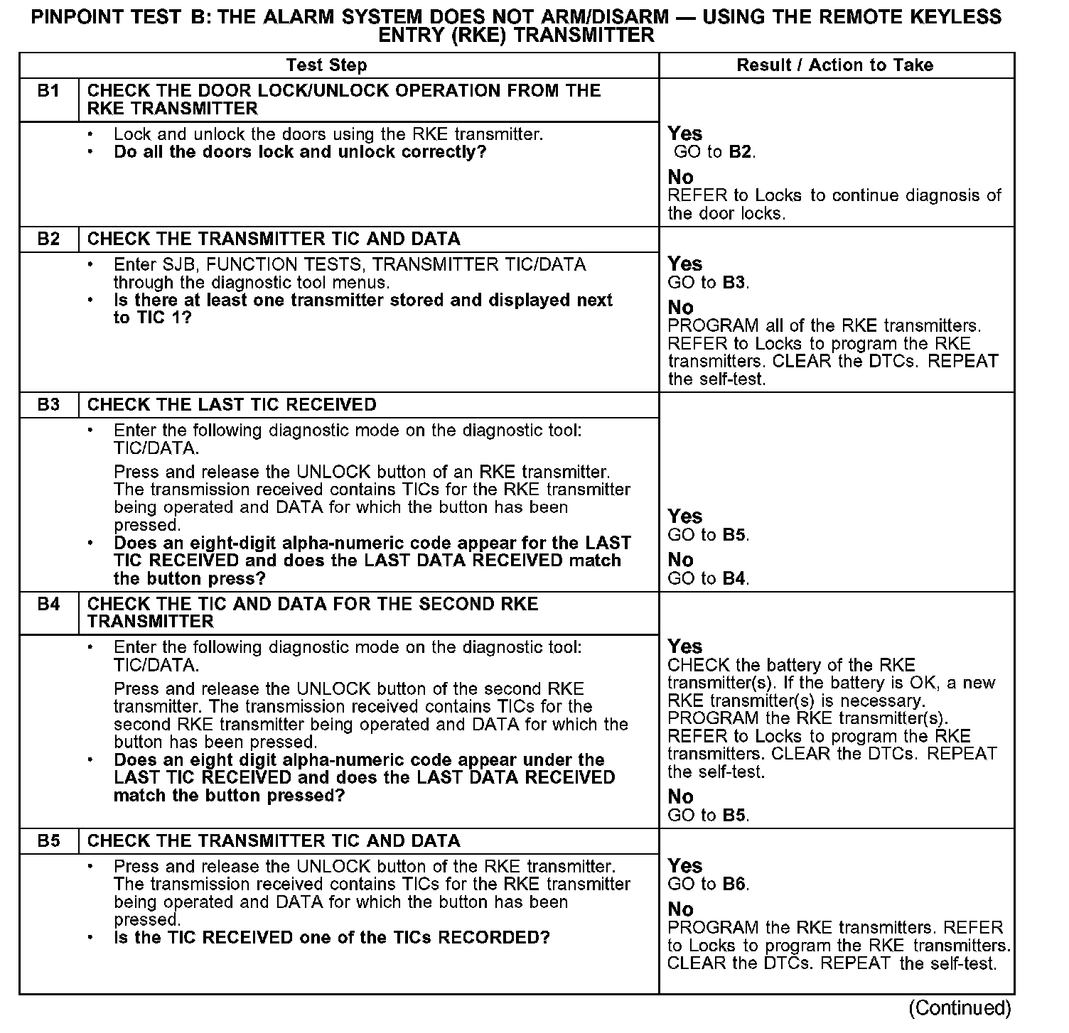 PINPOINT TEST B: THE ALARM SYSTEM DOES NOT ARM/DISARM - USING THE REMOTE KEYLESS ENTRY (RKE) TRANSMITTERB1-B5: