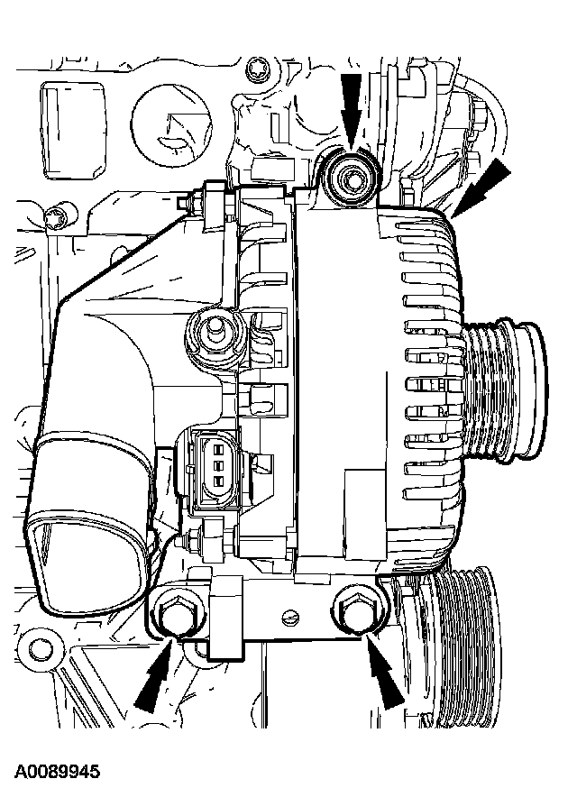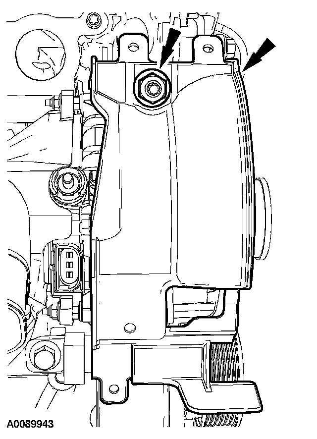 11. Remove the bolts and the accessory drive belt tensioner.
