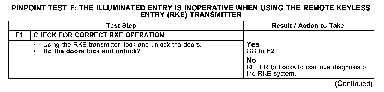 PINPOINT TEST F: THE ILLUMINATED ENTRY IS INOPERATIVE WHEN USING THE REMOTE KEYLESS ENTRY (RKE) TRANSMITTERF1: