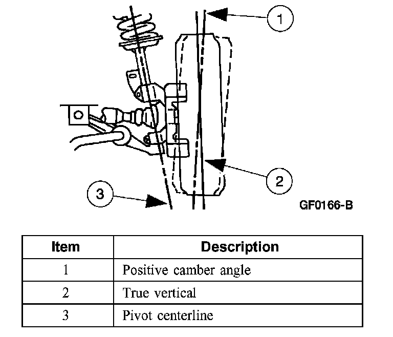 Caster is the deviation from vertical of an imaginary line drawn through the pivot points (top of strut and lower ball joint), when viewed from the side. The caster specifications will give the vehicle the best directional stability characteristics when loaded and driven. The caster setting is not related to tire wear.