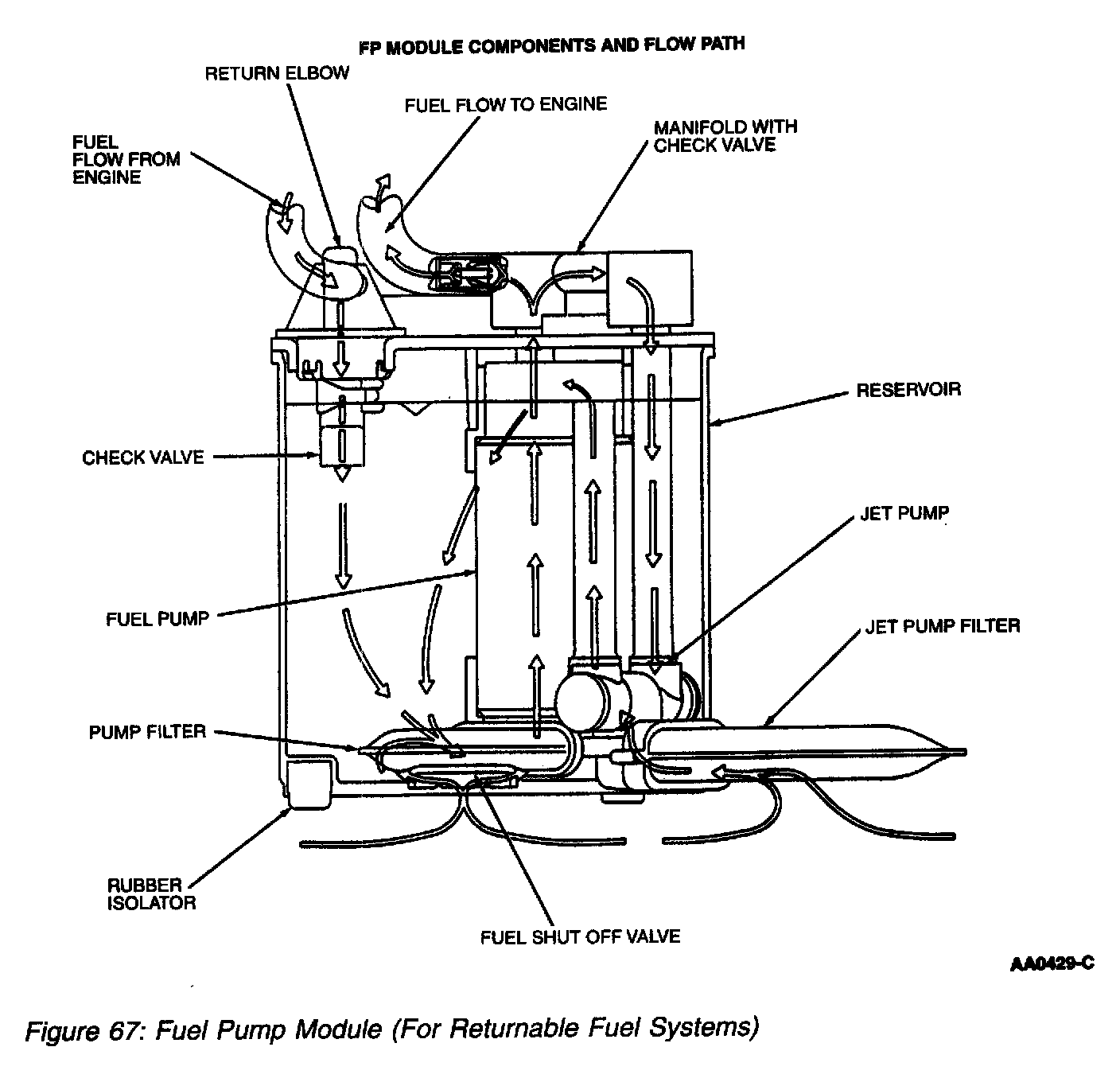 The fuel pump (FP) module is a device that contains the fuel pump and sender assembly. The fuel pump is located inside the FP module reservoir and supplies fuel through the FP module manifold to the engine and FP module jet pump. The jet pump continuously refills the reservoir with fuel, and a check valve located in the manifold outlet maintains system pressure when the fuel pump is not energized. A flapper valve located in the bottom of the reservoir allows fuel to enter the reservoir and prime the fuel pump during the initial fill.