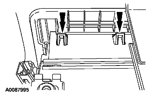 Through the glove box opening, push up to release the 3 lower deployment door clips (2 shown) from the instrument panel and push the lower end of the passenger air bag module out of the instrument panel, so the clips do not engage again.