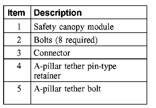 - The safety canopy must be installed in the vehicle using new torque-prevailing type J-nuts (W520822, 5 per side). Use of this J-nut is mandatory so as to reduce the risk of loss of fastener effectiveness. Failure to follow these instructions may result in personal injury in the event of a safety canopy deployment.