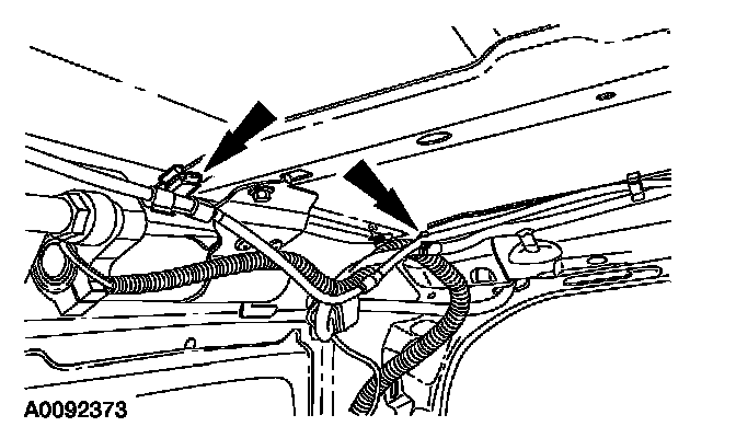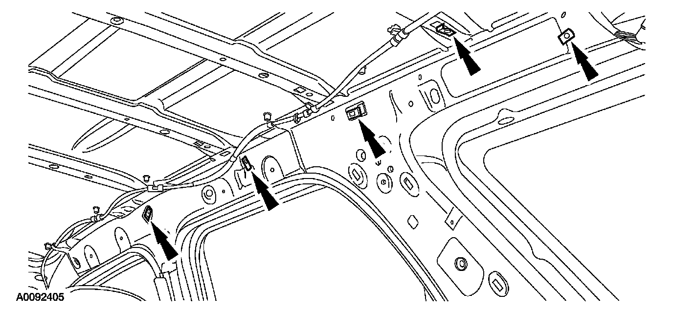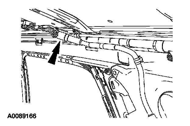 4. NOTE: If equipped with a moonroof and or rear window wiper assembly, note position and routing of the moonroof front drain hose and/or rear window washer solvent hose for installation purposes.