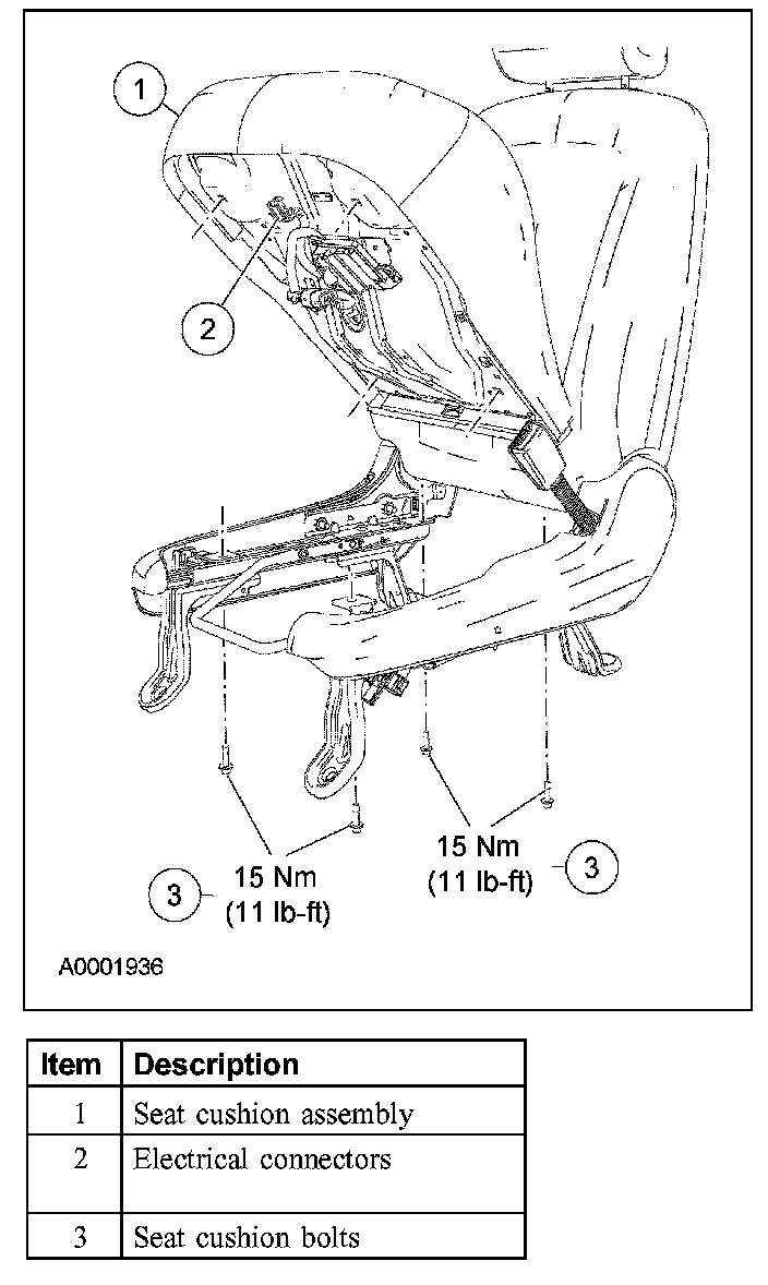 6. Install the 4 seat cushion bolts retaining the seat cushion to the seat track.
