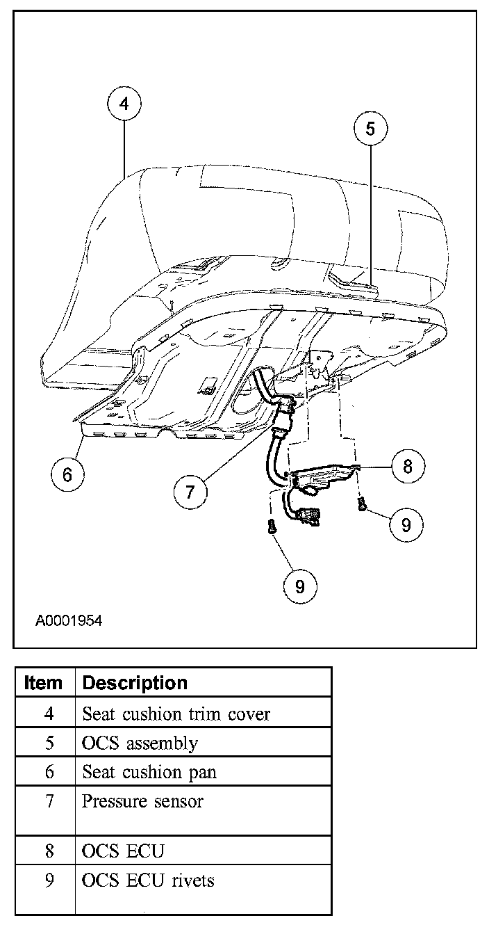 - Occupant classification sensor (OCS) system components (seat cushion foam pad, bladder with pressure sensor and electronic control unit) are calibrated to each other and are serviced as an assembly. The OCS system components are not to be installed separately. If a new OCS system, OCS system component or seat cushion foam pad are needed, a new OCS system service kit (seat cushion foam pad, bladder with pressure sensor and electronic control unit) must be installed as an assembly.