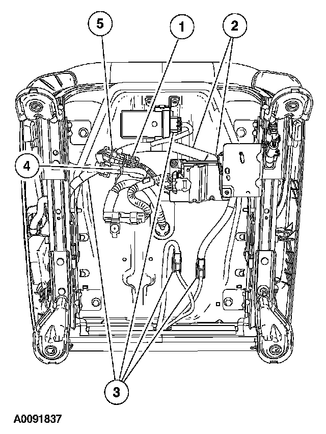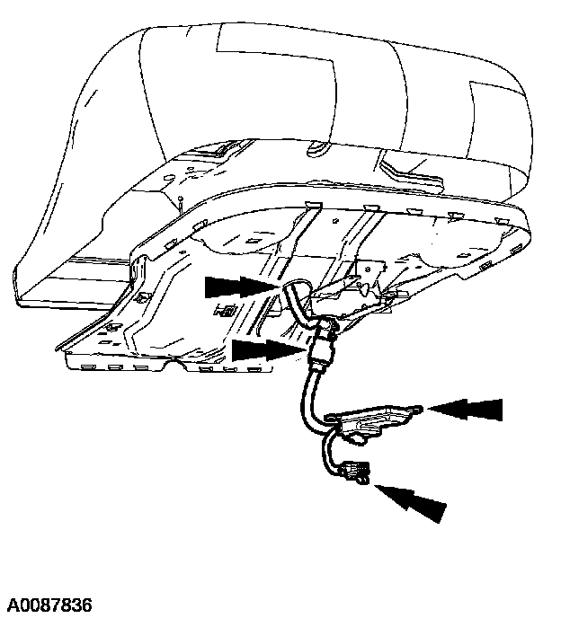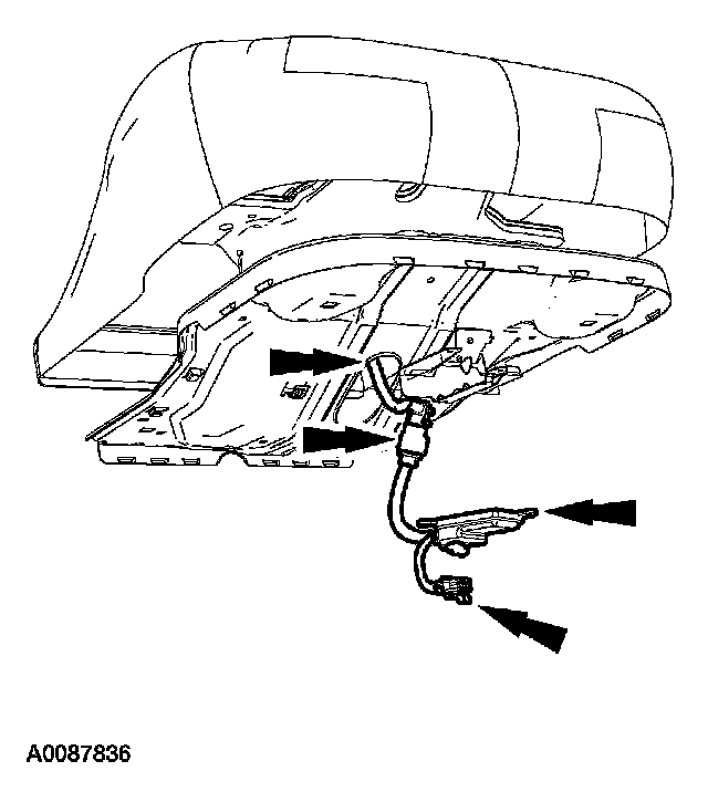 3 If equipped with heated seats, disconnect the heated seat module electrical connector, release the wiring clip on the wiring harness from the cushion pan, and disconnect the 2 cushion element electrical connectors.