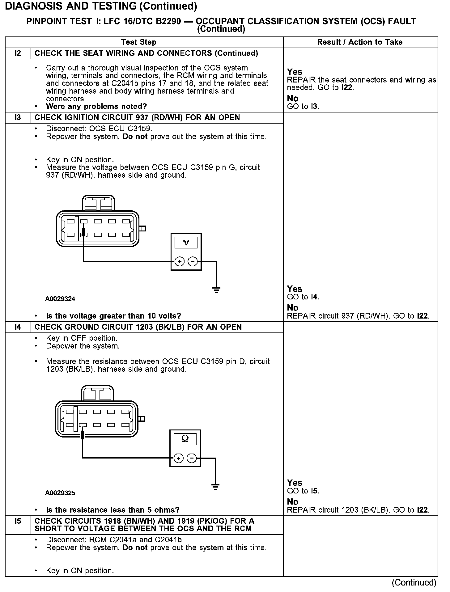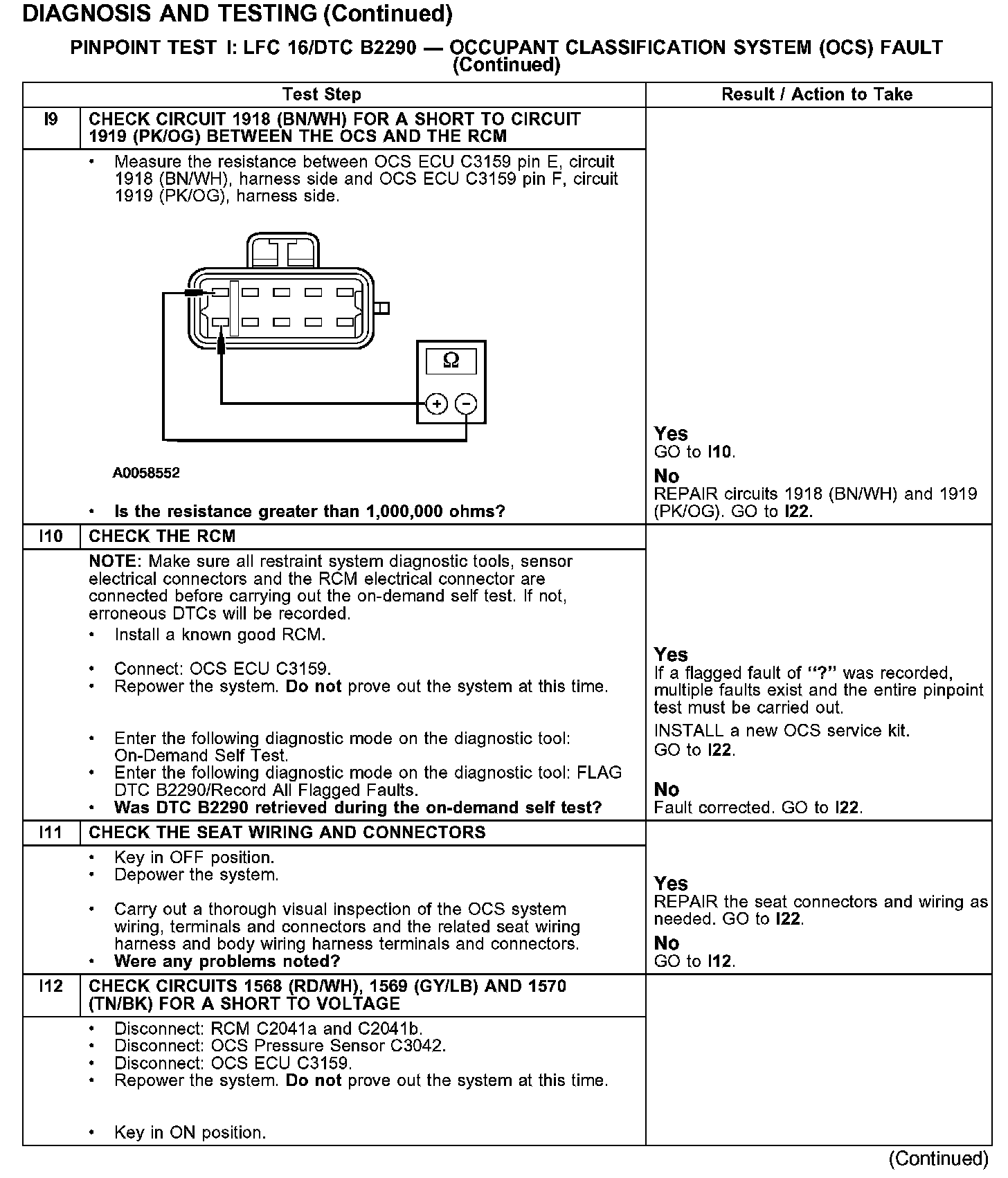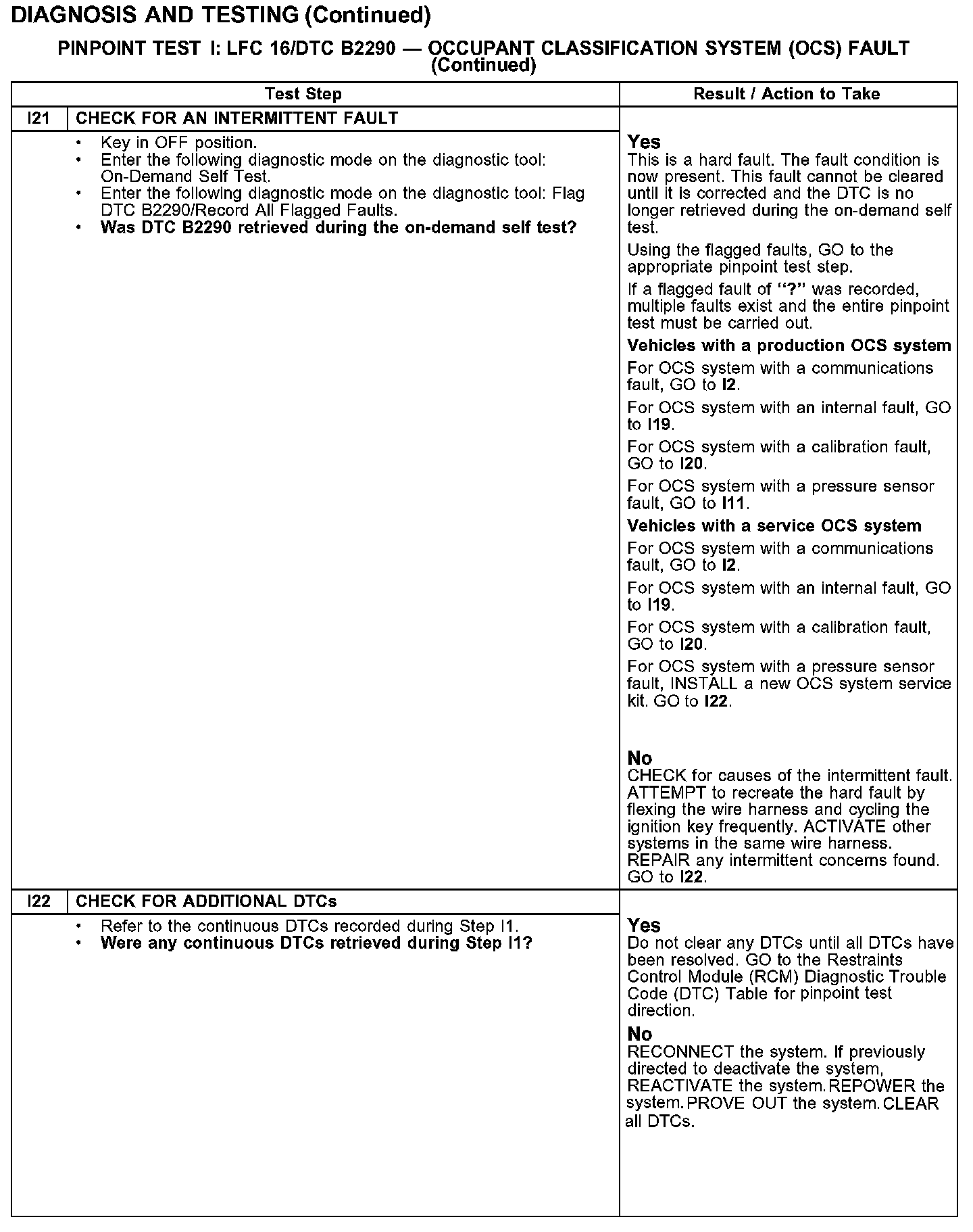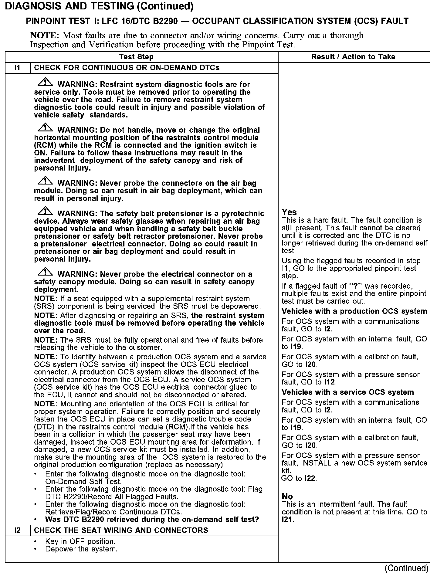 PINPOINT TEST I: LFC 16/DTC B2290 - OCCUPANT CLASSIFICATION SYSTEM (OCS) FAULTI1-I2: