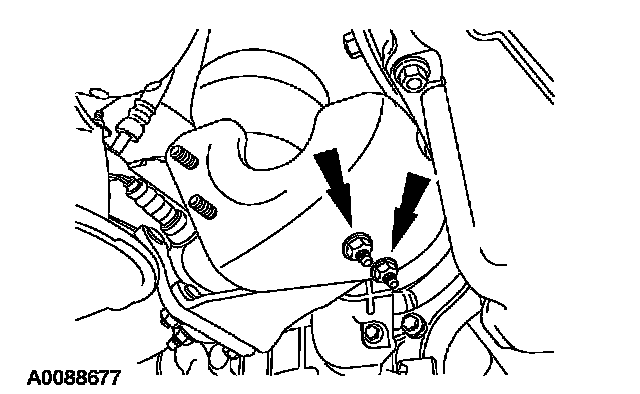 27. Remove the 2 nuts which hold the exhaust bracket to the rear engine mount.
