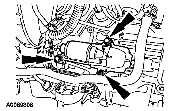 36. Remove the wire harness clip retainer and the ground wire from the starter bolts.