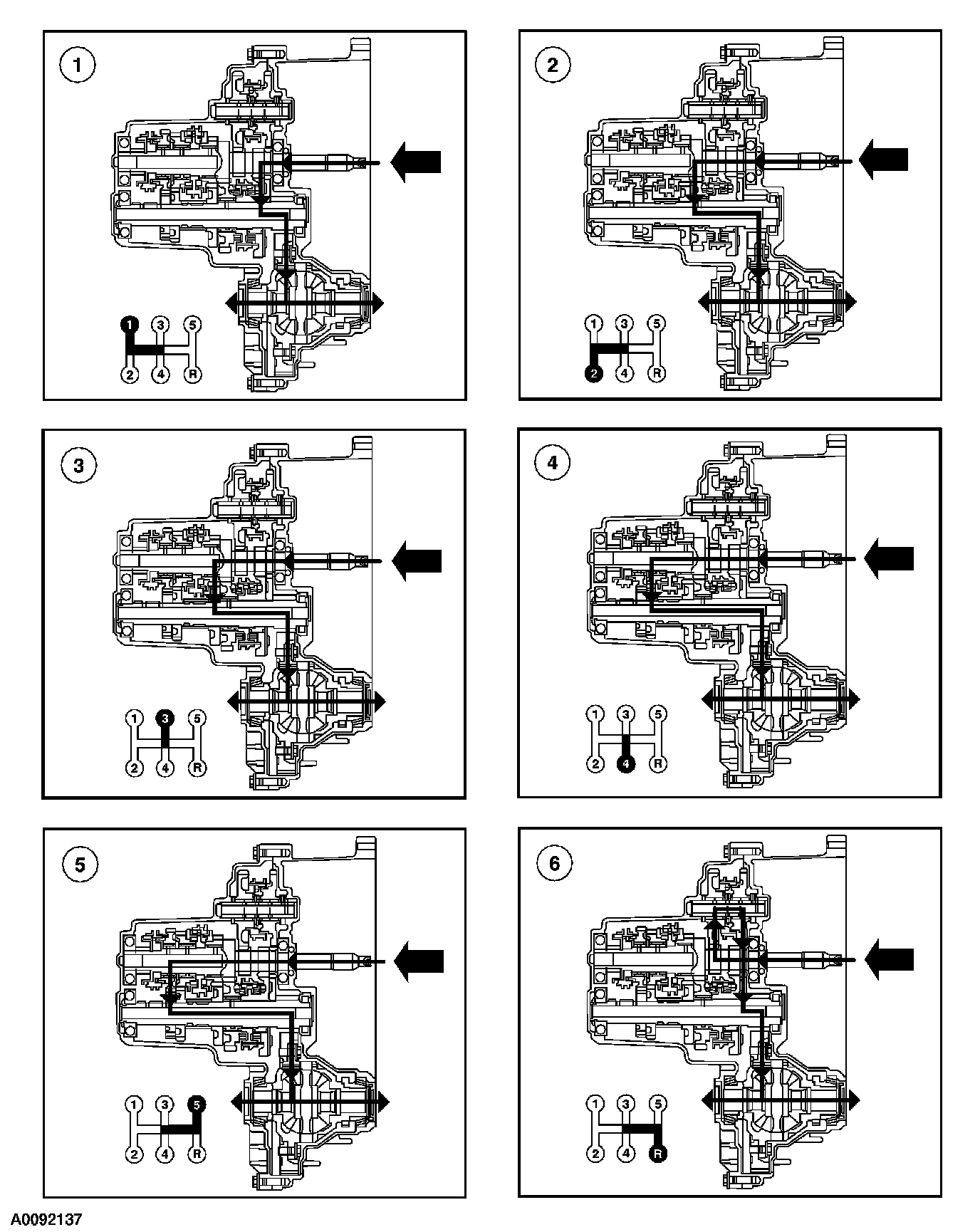 Manual TransaxleThe manual transaxle is a fully synchronized 5-speed transaxle. The forward gears are selected by a synchronizer mechanism. The third gear (3GR), fourth gear (4GR), and fifth speed cluster gear are mounted on the input shaft. First gear (1GR) and second gear (2GR) are mounted on the mainshaft. The helical-cut forward gears are in constant mesh with the corresponding gears on the opposing shaft. The manual transaxle features a synchronized reverse gear. The reverse gears have helical-cut teeth and are engaged through a synchronizer.