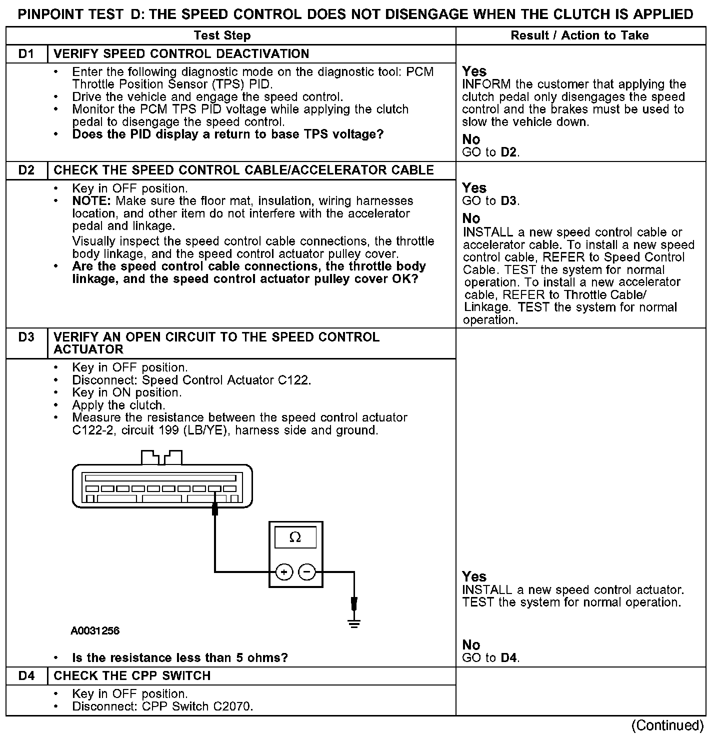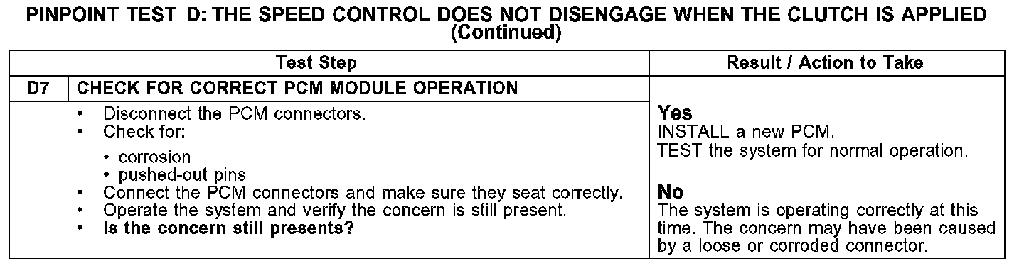 PINPOINT TEST D: THE SPEED CONTROL DOES NOT DISENGAGE WHEN THE CLUTCH IS APPLIEDD1-D4: