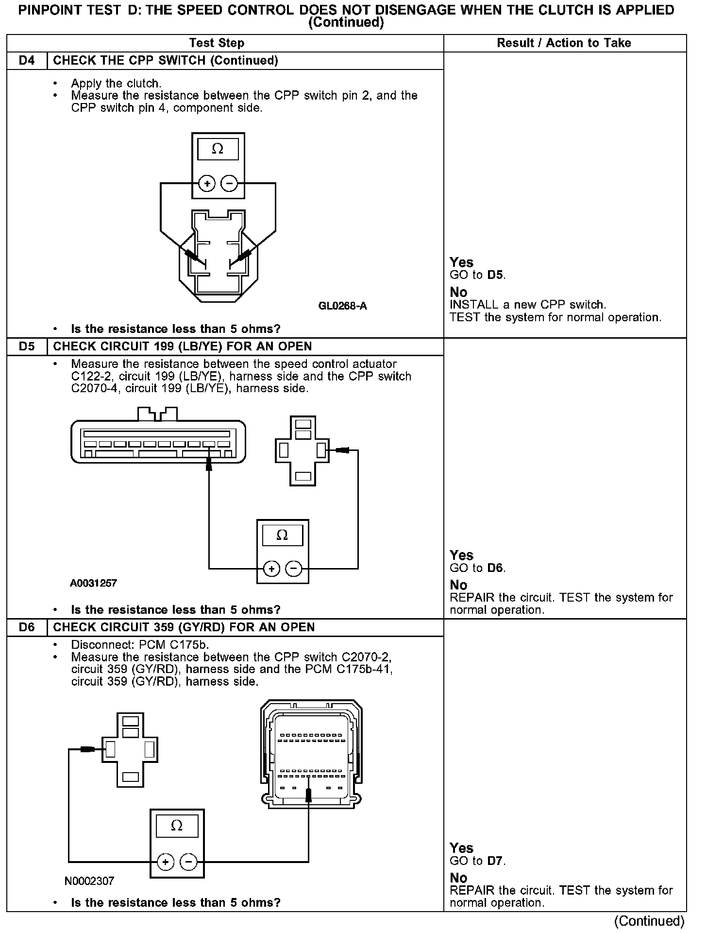 The speed control actuator sends a voltage reference signal through circuit 199 (LB/YE). When the clutch is applied, the clutch pedal position (CPP) switch closes and routes the signal to ground through circuit 359 (GY/RD). Ground is supplied by the powertrain control module (PCM).