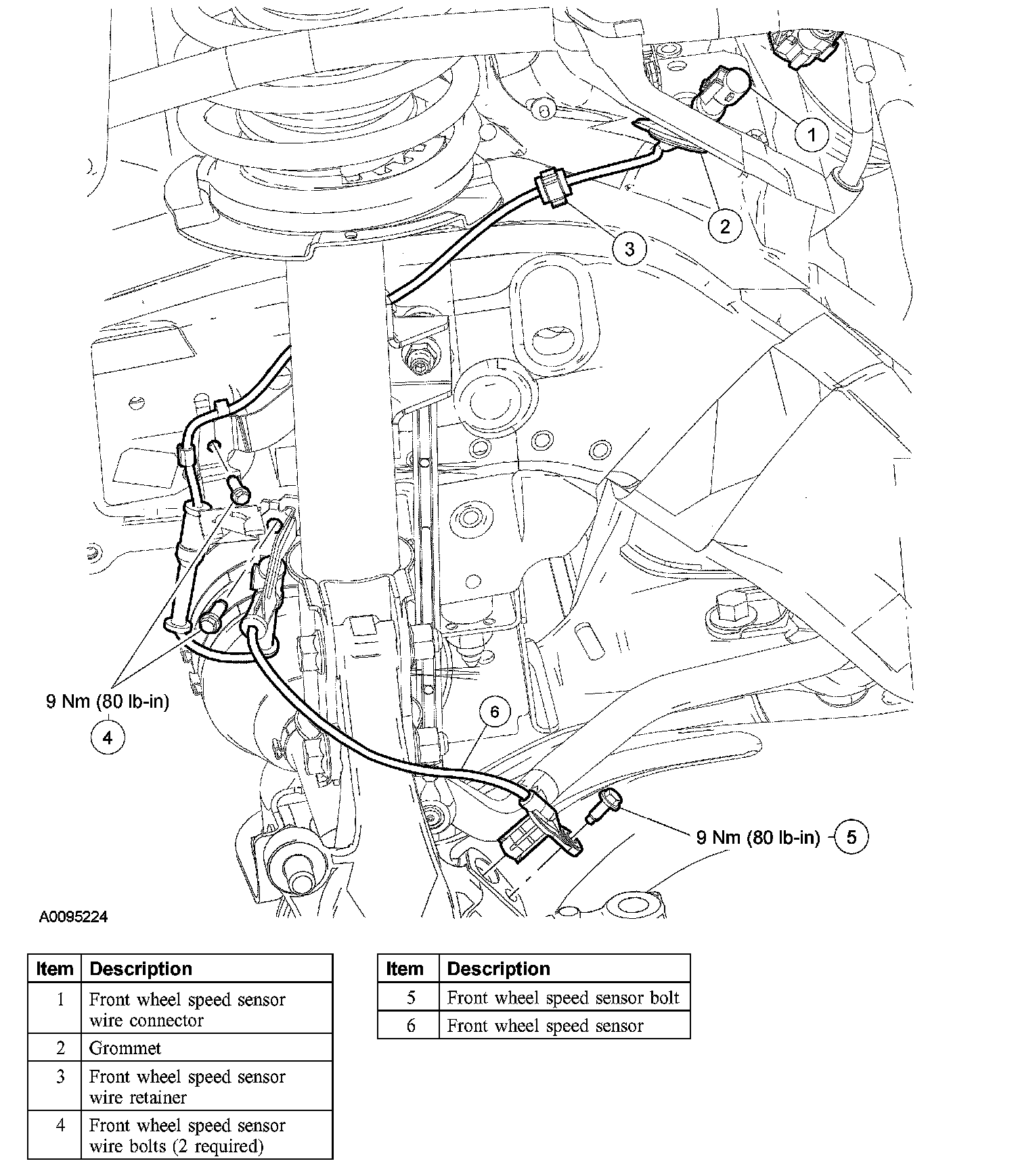 5. Remove the 2 front wheel speed sensor wire bolts.