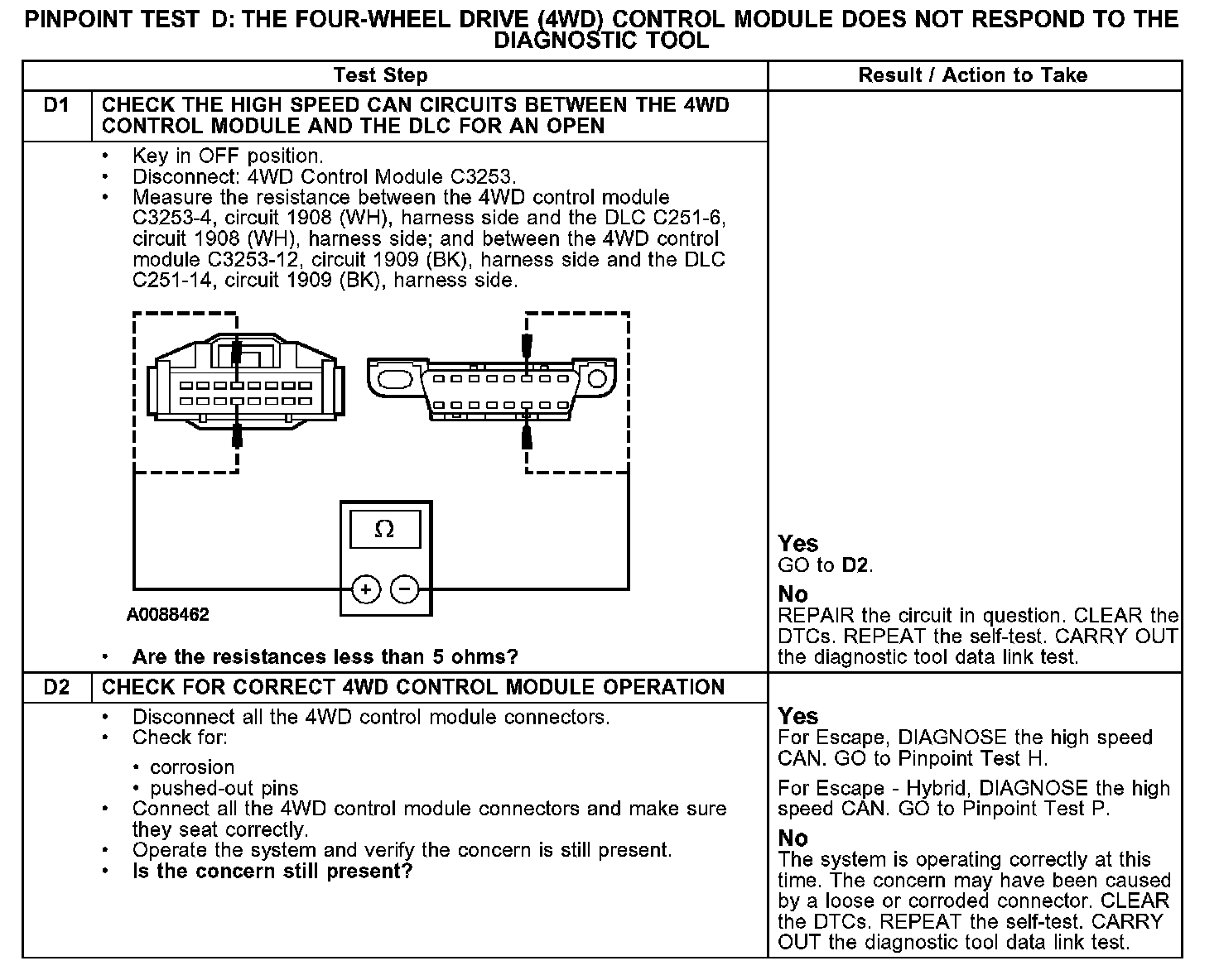 The 4WD control module communicates with the diagnostic tool through the high speed CAN communications network, circuits 1908 (WH) and 1909 (BK). If one of the bus wires becomes shorted to ground or voltage, communication can continue at a reduced level. Check circuits 1908 (WH) and 1909 (BK) between the 4WD control module C3253 and the data link connector (DLC) C251. Total resistance values must not be more than 5 ohms. If the resistance is more than 5 ohms there is an open in one of the high speed CAN circuits, damage to the DLC C251, damage to the 4WD control module C3253, or a problem in an in-line connector.