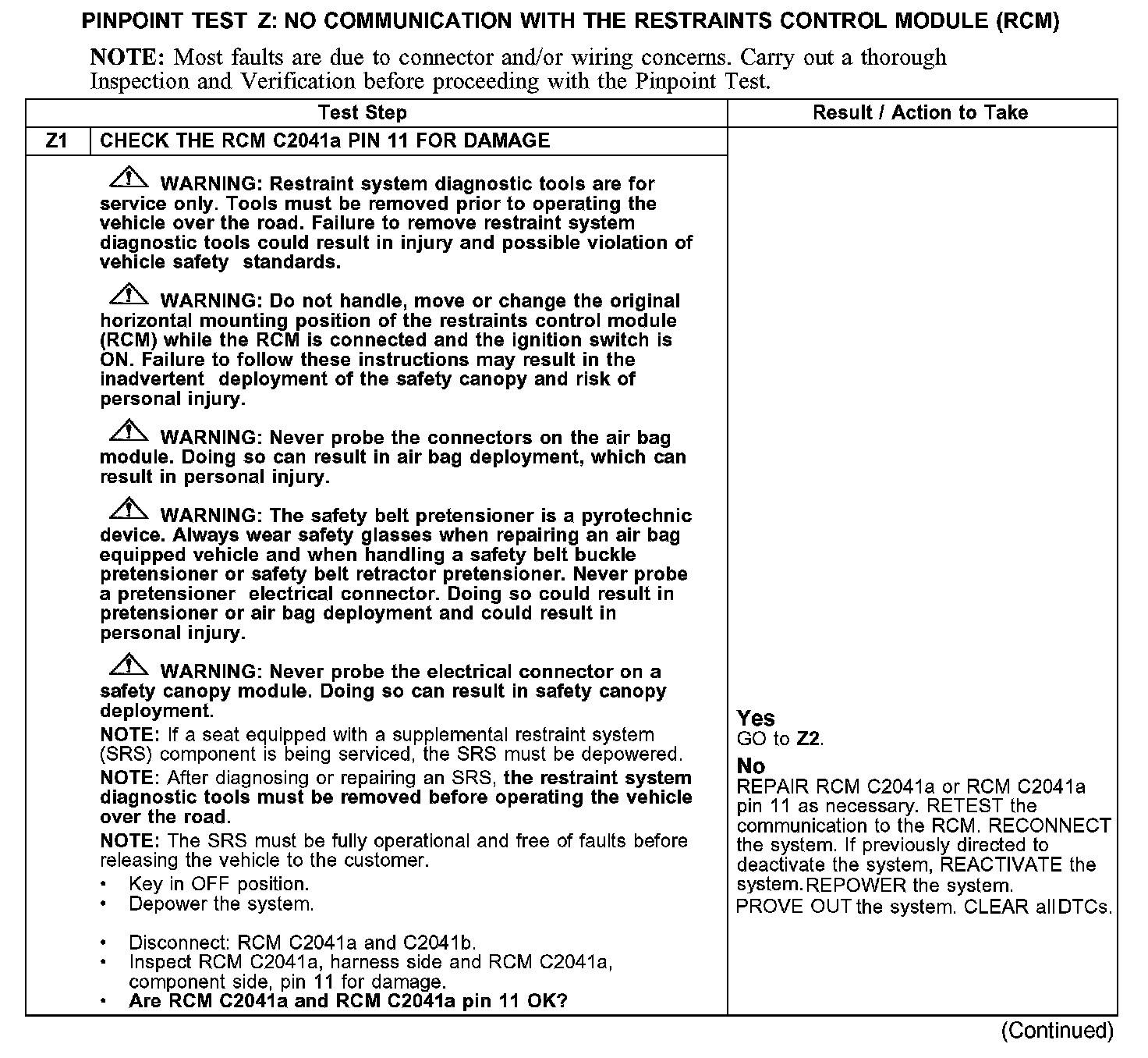 PINPOINT TEST Z: NO COMMUNICATION WITH THE RESTRAINTS CONTROL MODULE (RCM)Z1: