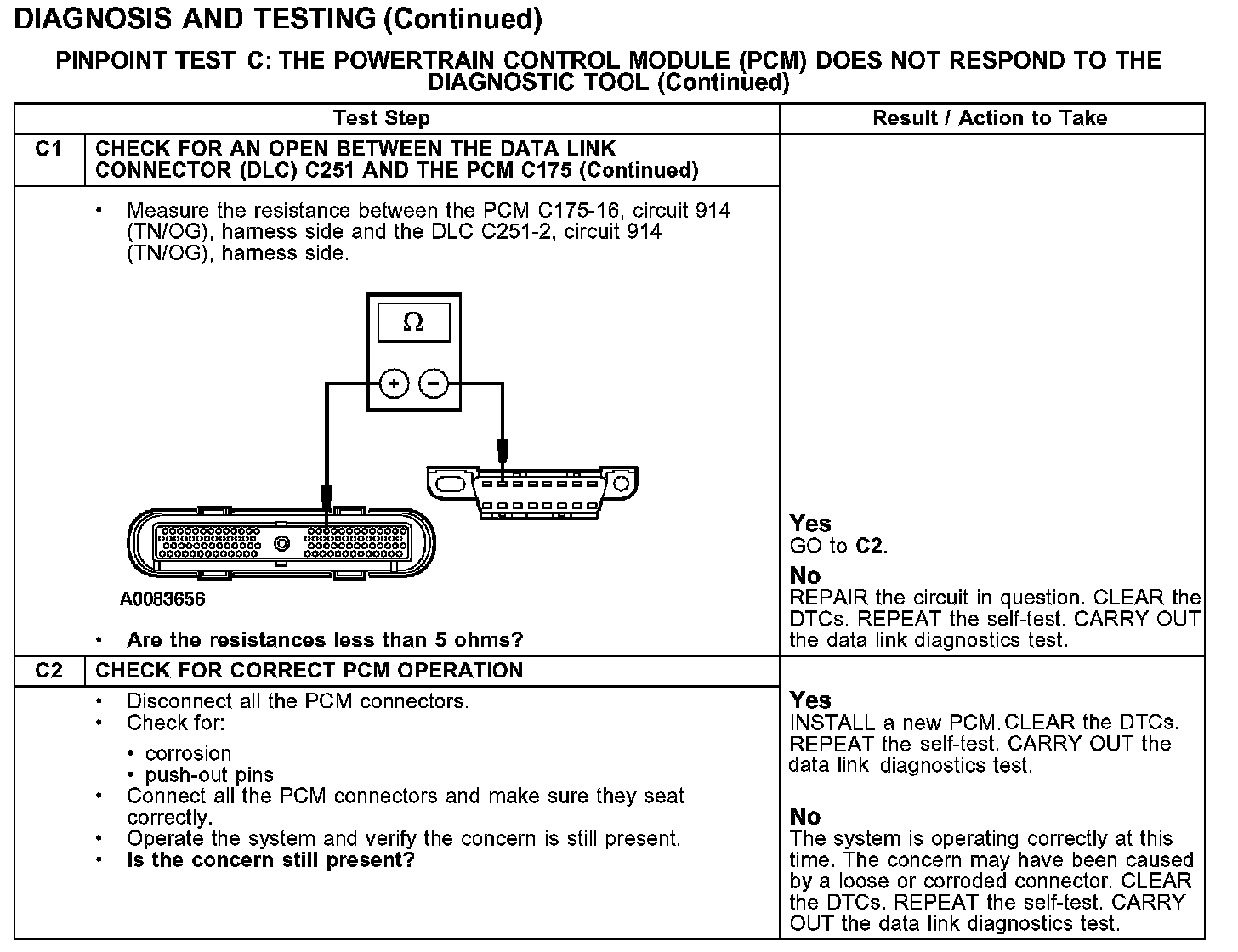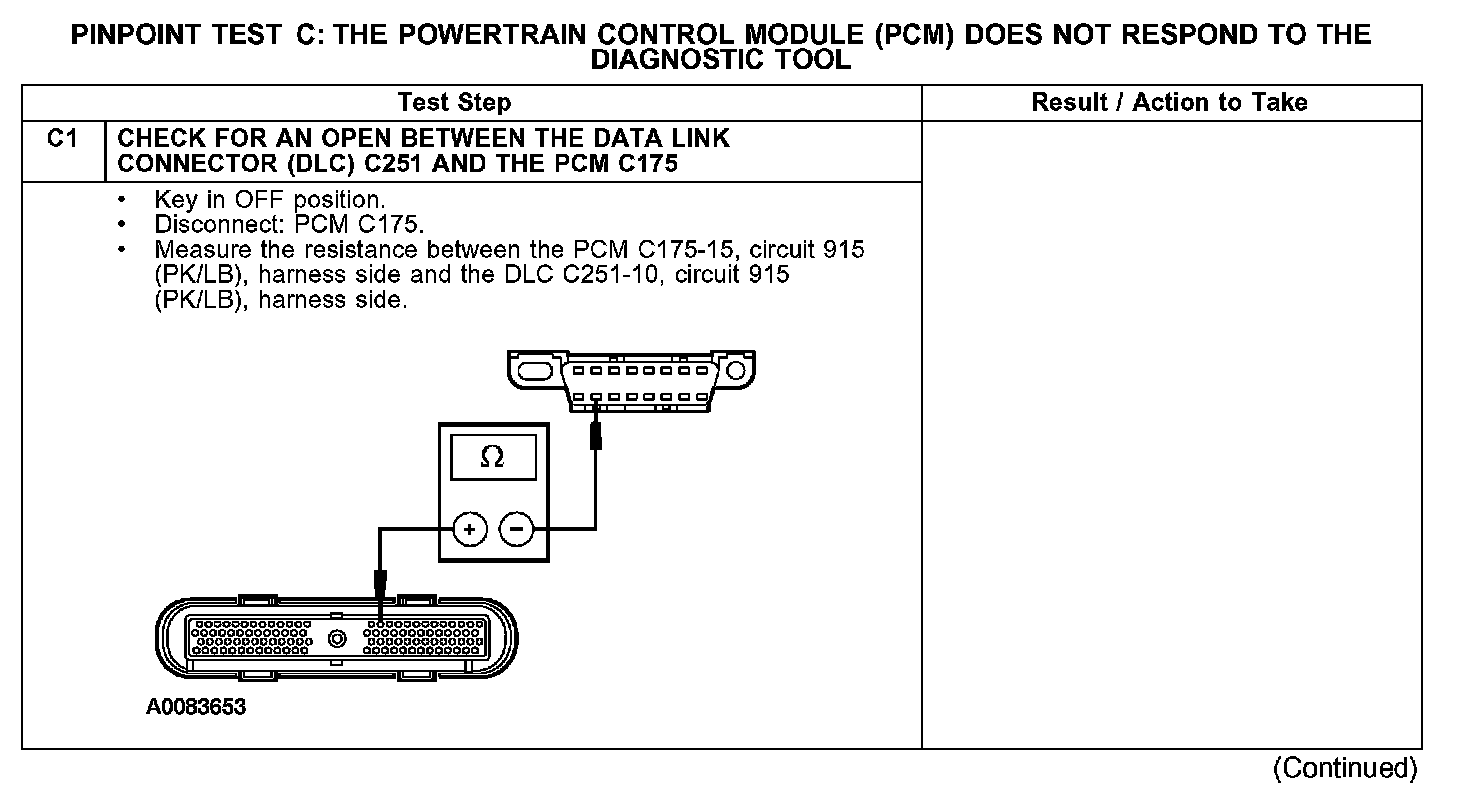 The PCM communicates with the diagnostic tool through the standard corporate protocol (SCP) communication network circuits 914 (TN/OG) and 915 (PK/LB). If one of the bus wires becomes shorted to ground or voltage, or if some but not all termination resistors are lost, communications can continue at a degraded level. Check SCP circuits 914 (TN/OG) and 915 (PK/LB) between the PCM C175 and the data link connector (DLC) C251. The total resistance values must not be more than 5 ohms. If the resistance is more than 5 ohms, there is either an open in the SCP network circuits, damage to the DLC C251, damage to the PCM C175, or a problem in the in-line connector.
