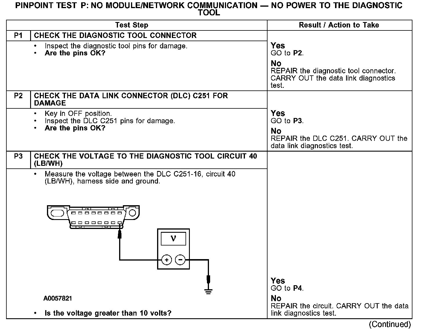 PINPOINT TEST P: NO MODULE/NETWORK COMMUNICATION - NO POWER TO THE DIAGNOSTIC TOOLP1-P3: