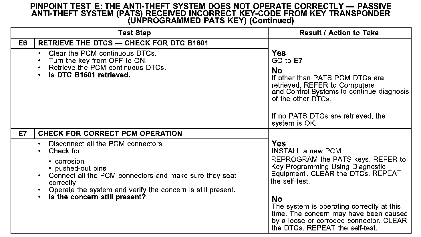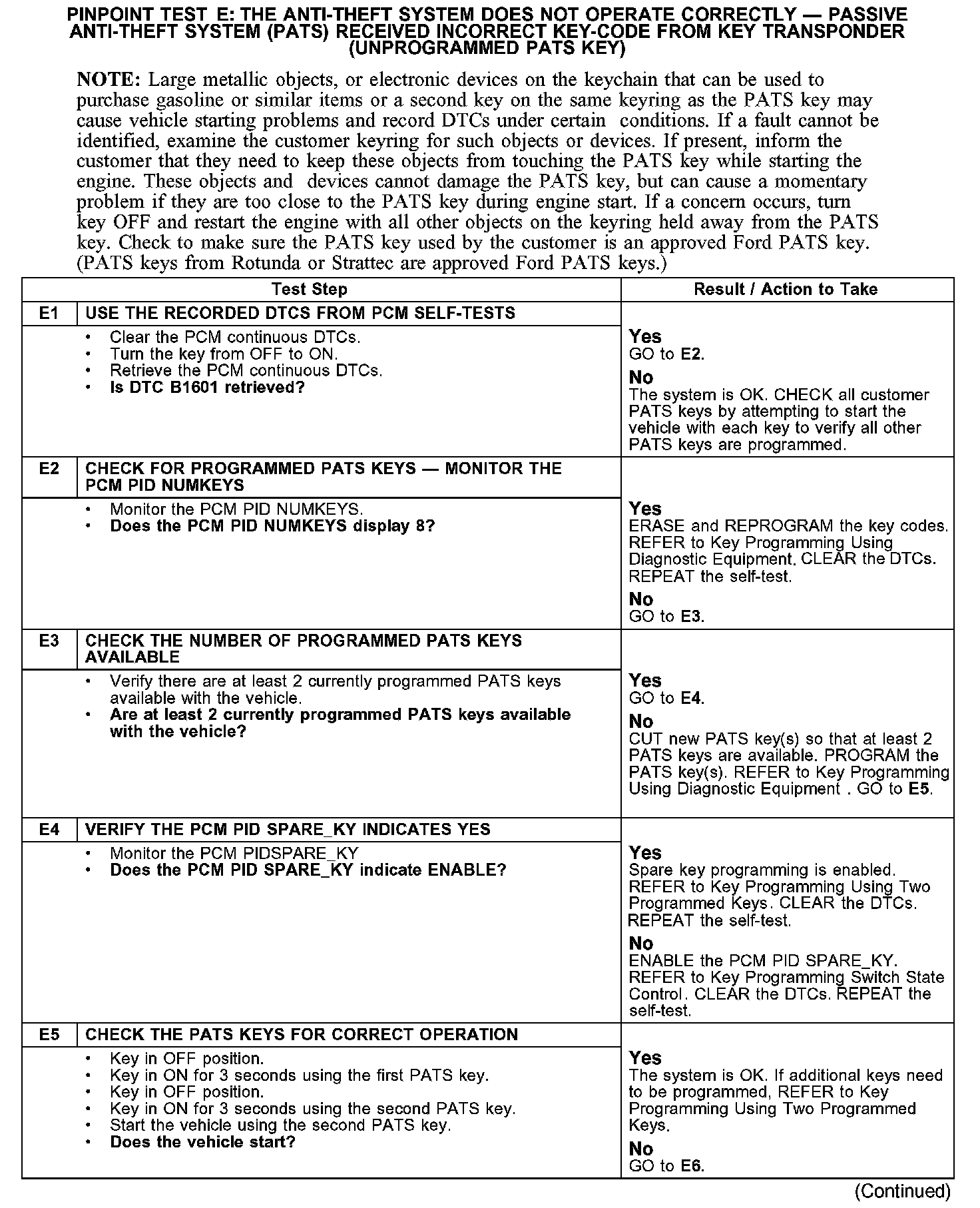 PINPOINT TEST E: THE ANTI-THEFT SYSTEM DOES NOT OPERATE CORRECTLY - PASSIVE ANTI-THEFT SYSTEM (PATS) RECEIVED INCORRECT KEY-CODE FROM KEY TRANSPONDER (UNPROGRAMMED PATS KEY)E1-E5: