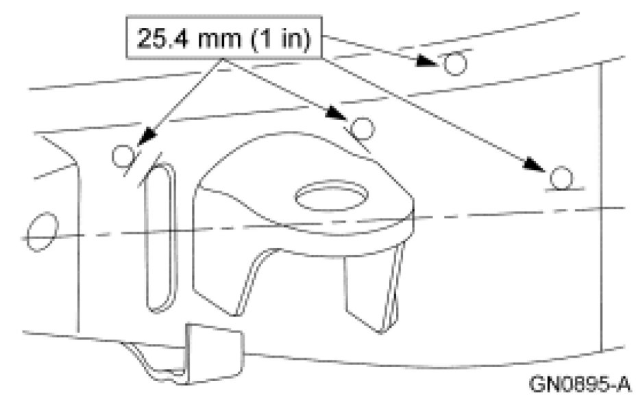 CAUTION: When drilling into a frame, the following conditions must be met: The hole being drilled must be at least 25.4 mm (1.01 in) or greater in distance from the edge of the nearest hole, the edge of a flange, above the frame centerline or any other existing bracket or component.