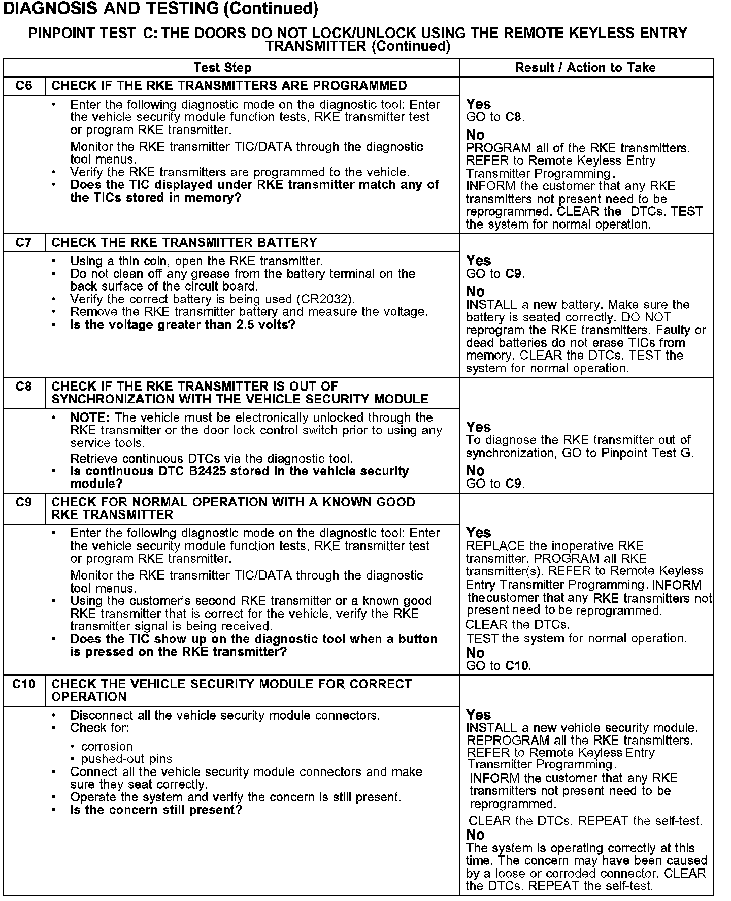 PINPOINT TEST C: THE DOORS DO NOT LOCK/UNLOCK USING THE REMOTE KEYLESS ENTRY TRANSMITTERC1-C5: