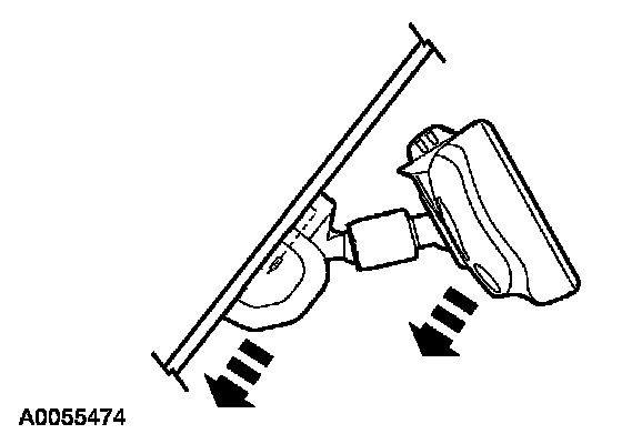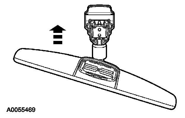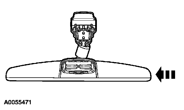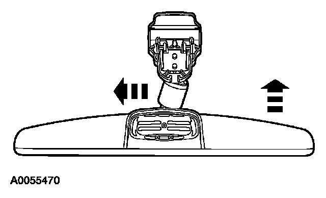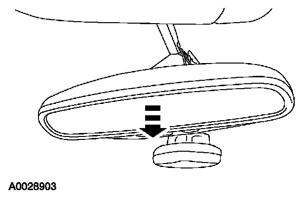 3. Position the interior rear view mirror in the full down position. Grasp the interior rear view mirror and rotate in a direction downward and toward the windshield until released from the mirror windshield bracket.