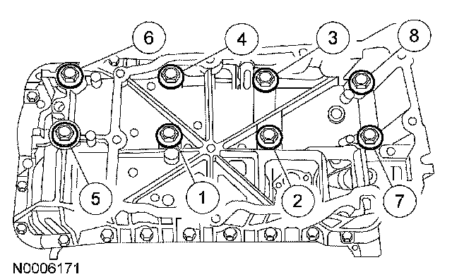 58. Tighten the cylinder block cradle inner bolts in the sequence shown 2 stages.
