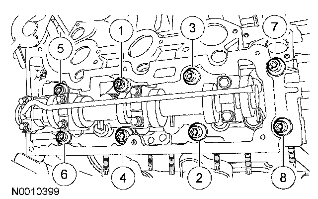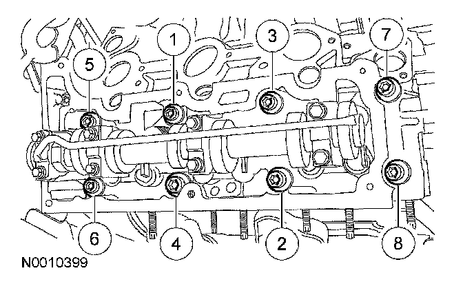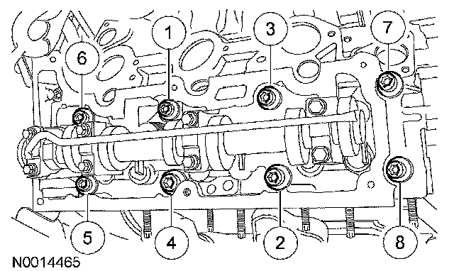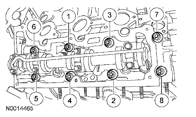 Install the RH cylinder head. Install 8 new 12 mm bolts and tighten in the sequence shown in 2 stages.