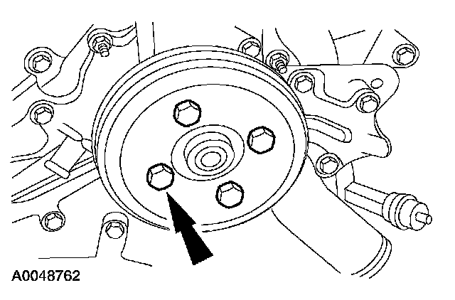 74. Install the coolant pump pulley and the bolts.