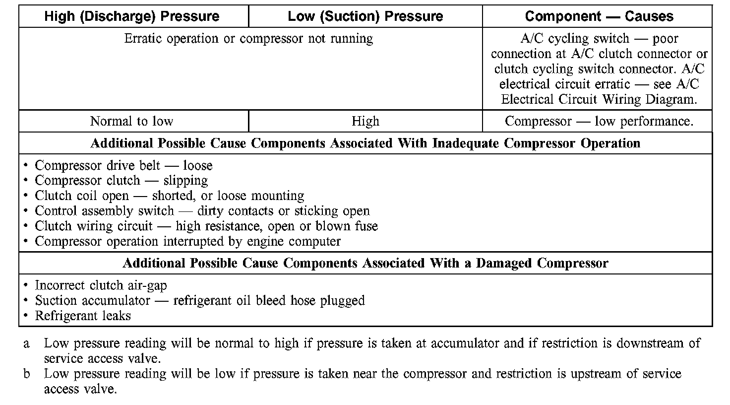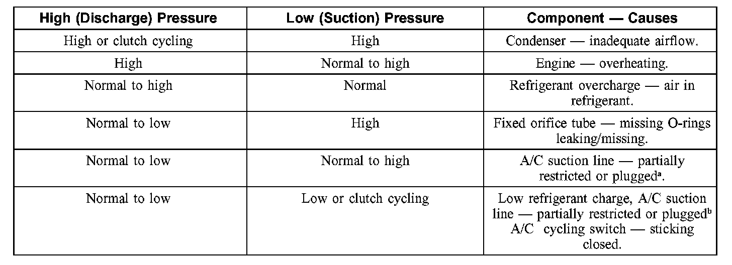 1. NOTE: The table is used to guide diagnosis of the refrigerant system if operating pressures are outside normal limits.