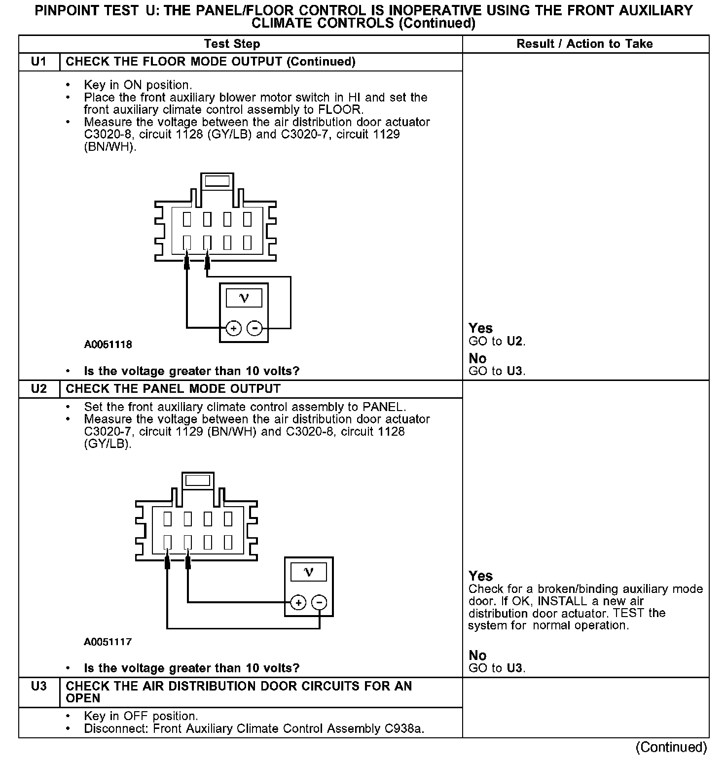 PINPOINT TEST U: THE PANEL/FLOOR CONTROL IS INOPERATIVE USING THE FRONT AUXILIARY CLIMATE CONTROLSU1: