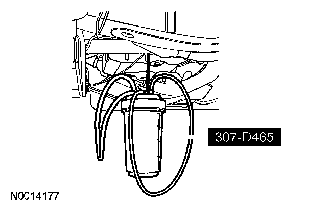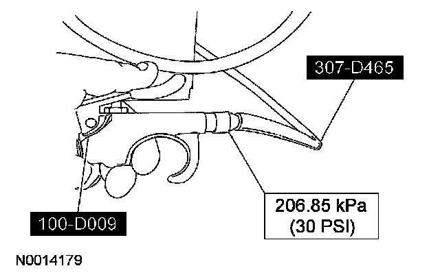 12. Apply a maximum of 206.85 kPa (30 psi) to the open end of the vacuum/pressure hose from the special tool. Fluid will immediately start flowing out of the special tool into the transmission fluid pan.