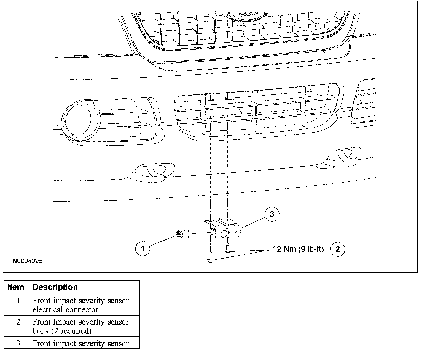 5. WARNING: The tightening torque of the air bag front impact severity sensor retaining bolts is critical for correct system operation.
