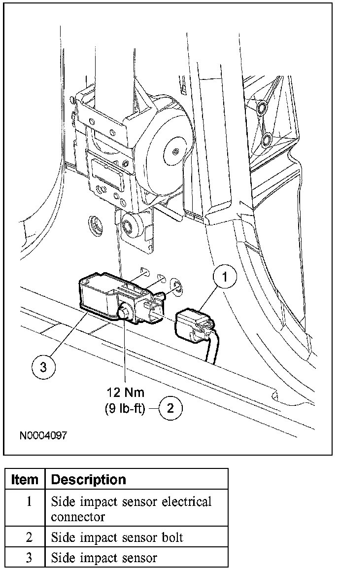 6. WARNING: The tightening torque of the air bag side impact sensor retaining bolt is critical for correct system operation.