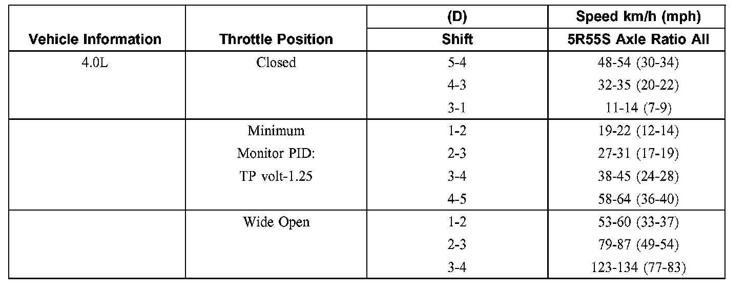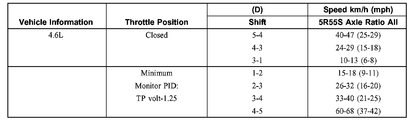 5. Press the accelerator pedal to the floor, Wide Open Throttle (WOT). The transmission should shift from 3rd to 2nd or 3rd to 1st, depending on vehicle speed and torque converter clutch should release.