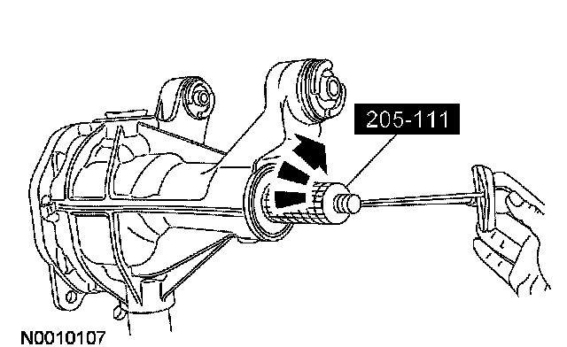 ^ Position the clutch housing gauge needle in the differential carrier spreader adapter hole.