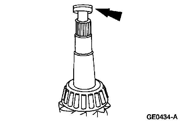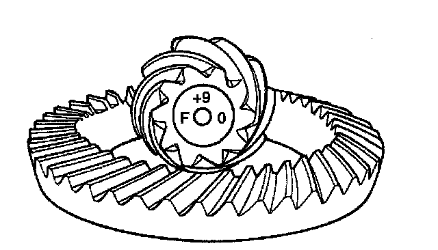 ^ If installing a new gearset, notice the plus (+), minus (-) or zero (0) etching on the new drive pinion, and adjust the thickness of the new drive pinion position shim. If etching is plus (+), subtract the number from the gauged drive pinion position shim thickness. If etching is minus (-), add the number to the gauged drive pinion position shim thickness.