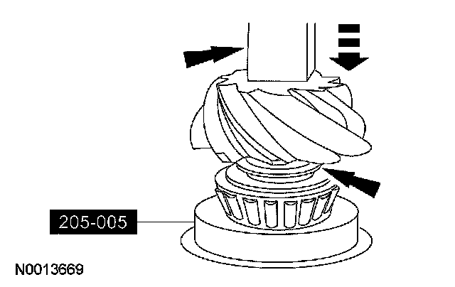 ^ Using the special tool and a suitable press, seat the inner pinion bearing firmly against the drive pm1on position shim.