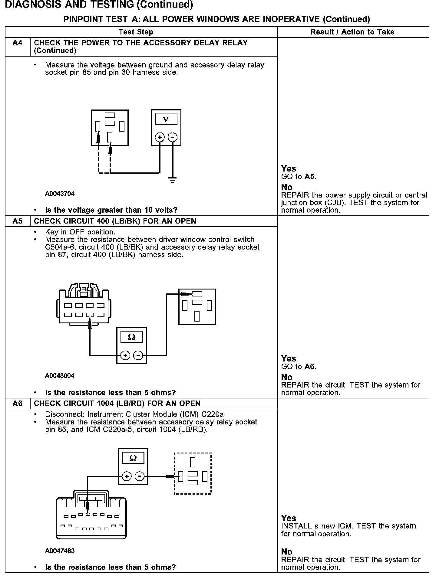 Under normal operation the instrument cluster module grounds the accessory delay relay through circuit 1004 (LB/RD). Power is sent to the driver window control switch through circuit 400 (LB/BK) from the accessory delay relay. The driver window control switch is grounded through circuit 1205 (BK).